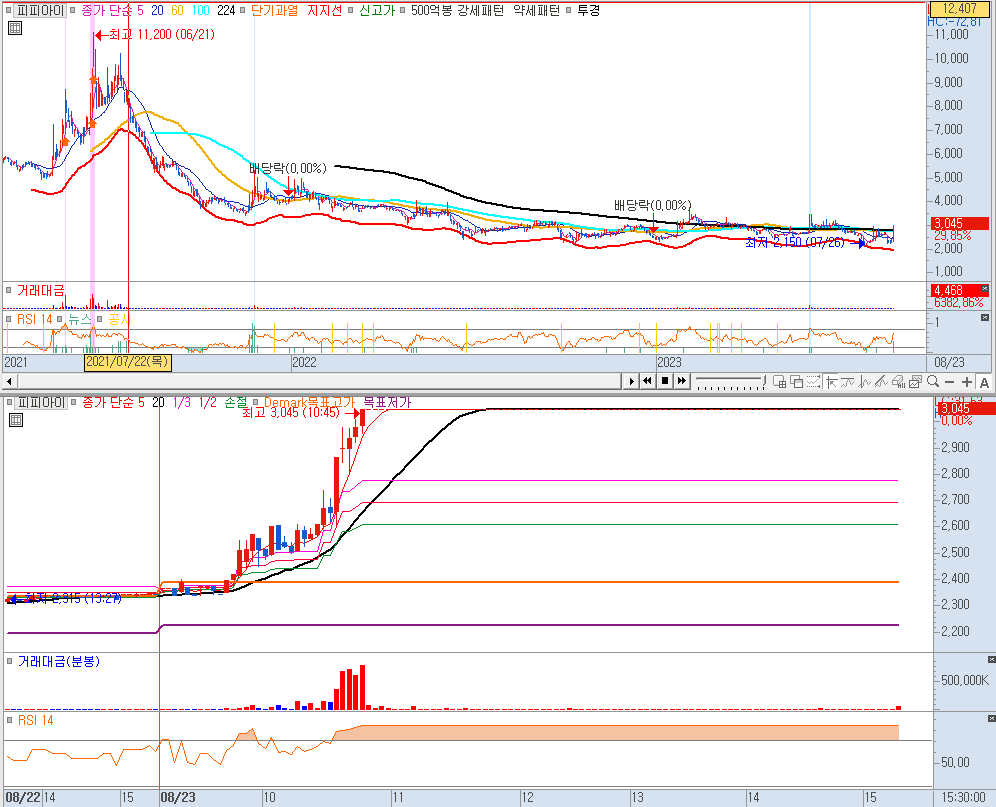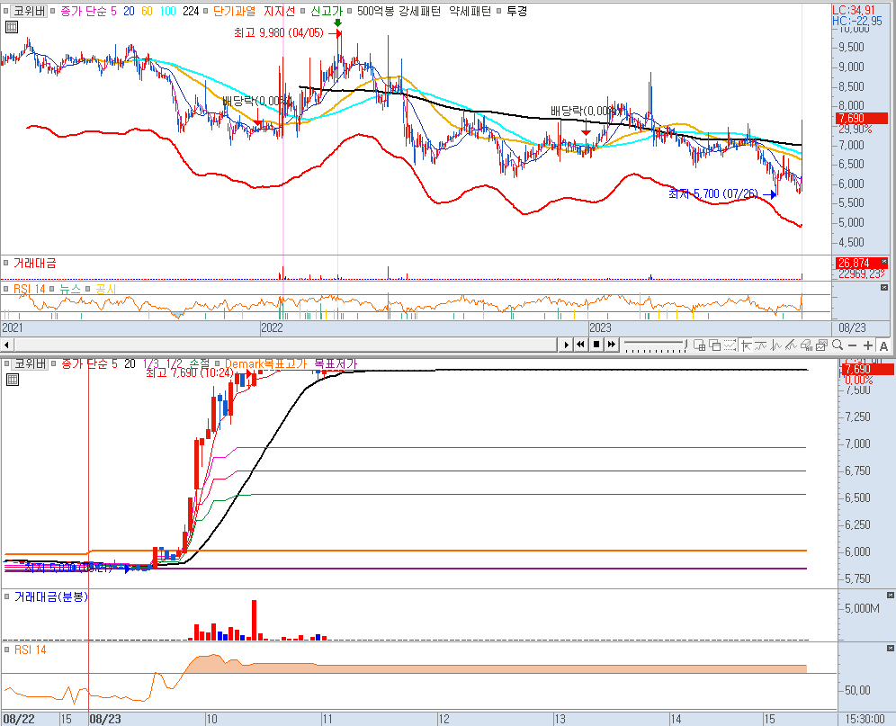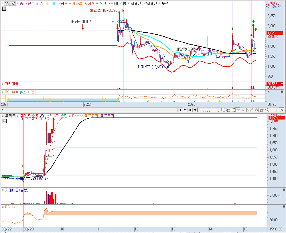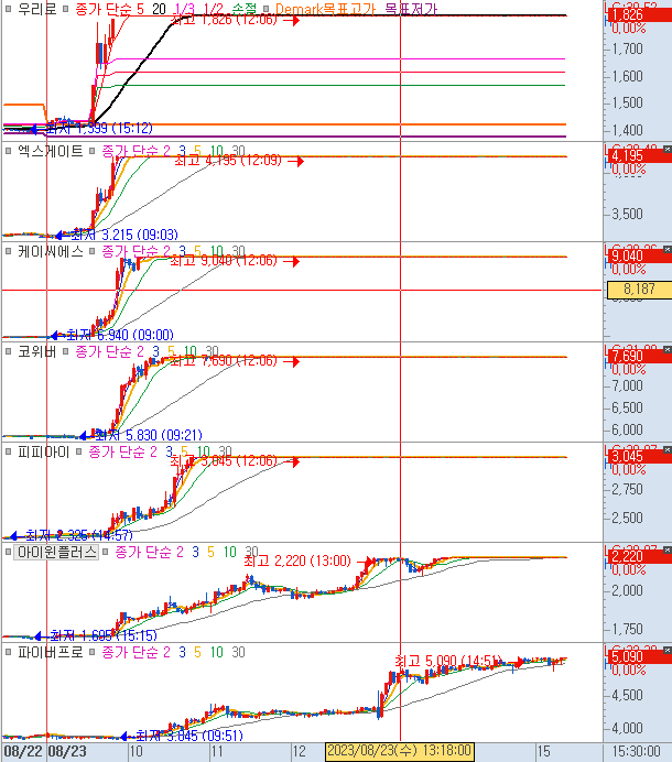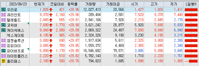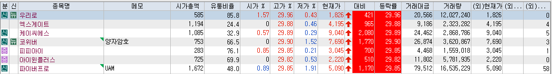 우리로 부터 파이버프로까지 시간순으로 상한가를 도착한 순서입니다. 상한가 외 종목들이 있긴 한데 상한가가 이렇게 많은데 굳이 볼 필요가 없겠죠. 시장에서 인정한 대장주들입니다.