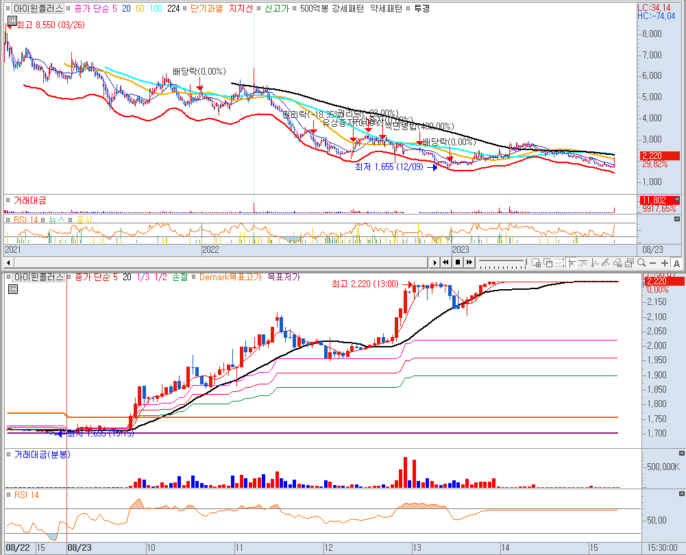 아이원플러스는 2020년 SK텔레콤 전용 5G 스마트폰 '갤럭시 A 퀀텀'에 양자암호보안 핵심 부품인 초소형 'QRNG' 모듈을 공급한 바 있습니다. 시총 725억, 오늘 거래대금 118억 들어왔습니다. 유통시총 506억입니다. 차트를 보니 보고 싶지 않네요.