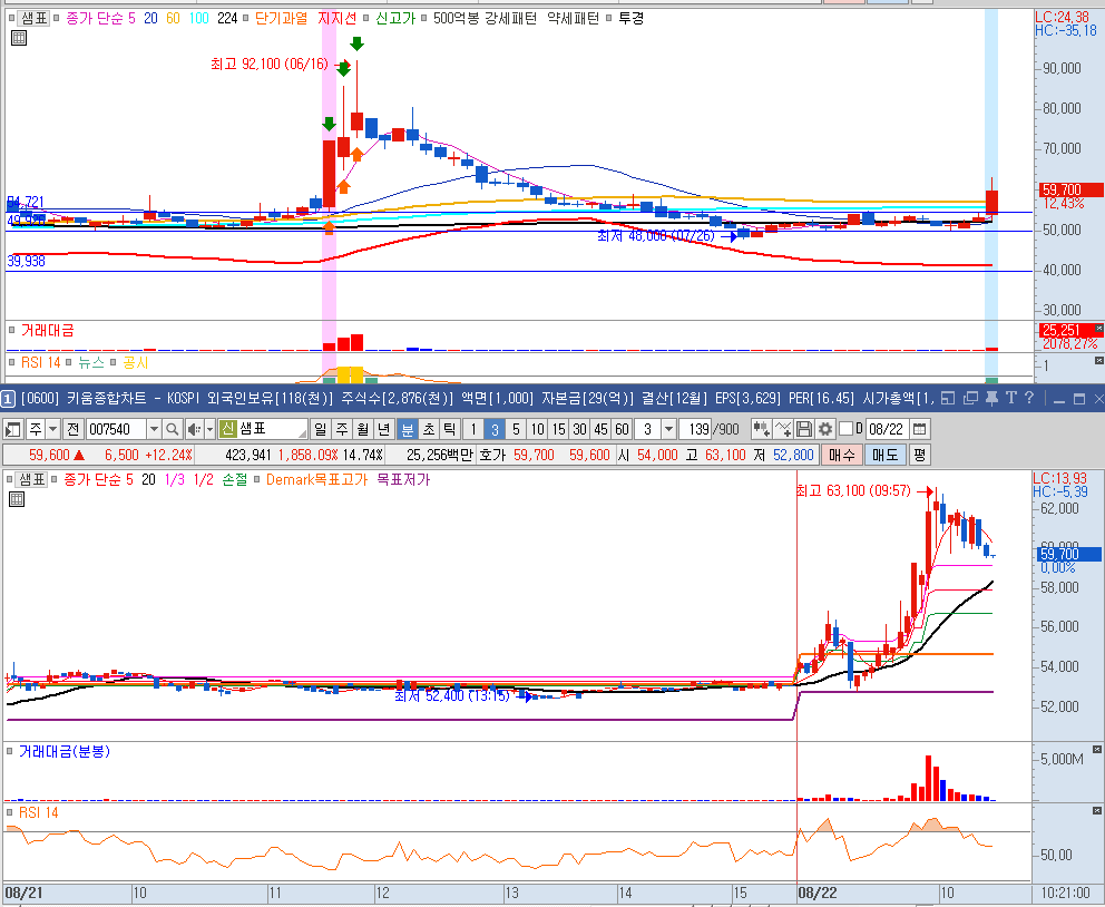 지주회사부문과 식품사업 부문이 있으며 식품사업에는 샘표식품 , 양포식품등의 회사가 있습니다. 국산 천일염과 호주산 천일염까지 공급망을 확보하고 있습니다. 시총 1728억, 유통시총 565억입니다. 거래대금은 250억으로 유통시총의 절반이 몰렸습니다.